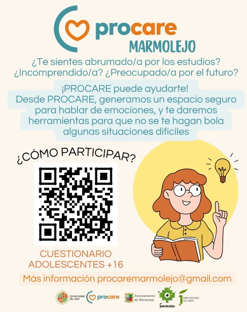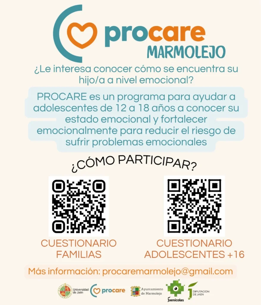La Universidad de Jaén, en colaboración con el Excmo. Ayuntamiento de Marmolejo y la Diputación Provincial de Jaén, pone en marcha esta iniciativa que pretende que las personas adolescentes de la provincia de Marmolejo de 12 y 18 años y sus familias conozcan el estado emocional de sus hijos/as. Para ello, PROCARE habilita una encuesta enfocada hacia adolescentes de 12 a 18 años del municipio.